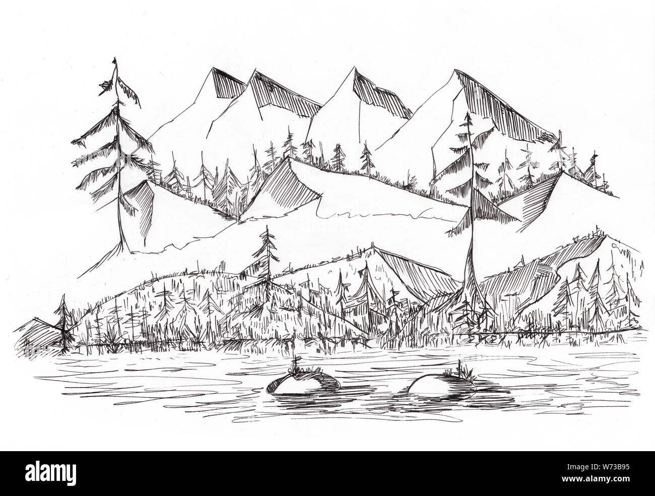 Paysage Landscape Dessin Drawing Blue Ink Mountain Drawing By Tony Pereira Ferreira Artmajeur from www.artmajeur.com Notice that every area has a unique stroke direction. Begin with a simple sky and mountain range, then add trees and a beach.
