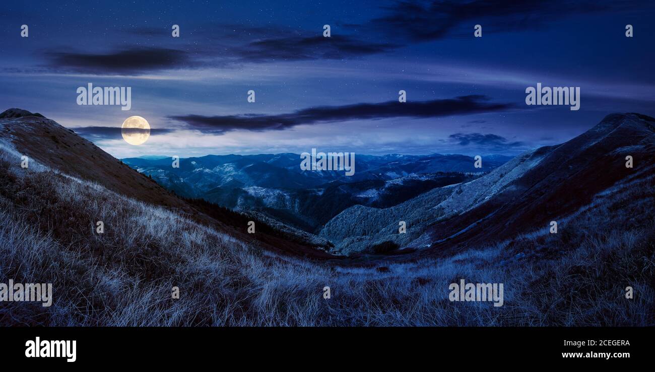 Amazing landscape with high himalayan mountains, beautiful curving river, green forest, blue sky with clouds and yellow sunlight in autumn in nepal.