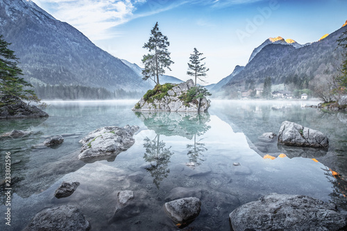 Epic mountain to climb around the world. Custom terrain shader with parallax and snow regulation. Find the perfect epic landscapes stock photo. Epic mountain sunrise landscape with picturesque lagoon and large lava boulders.