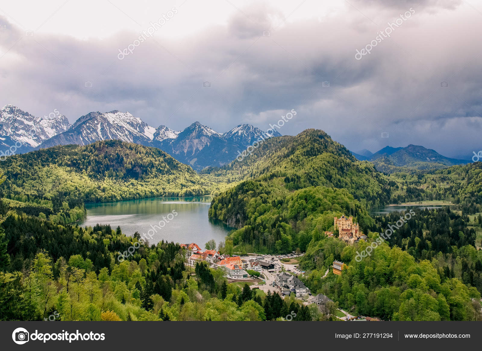 The calm and warm evening on lake. A steep cliff front borders its western shores and standing on the top of the cliffs gives the viewer a great view. Mountains and lakes are just some of the wonders that nature can offer. Forest path tunnel through trees near lake, scenic nature autumn landscape panorama view.